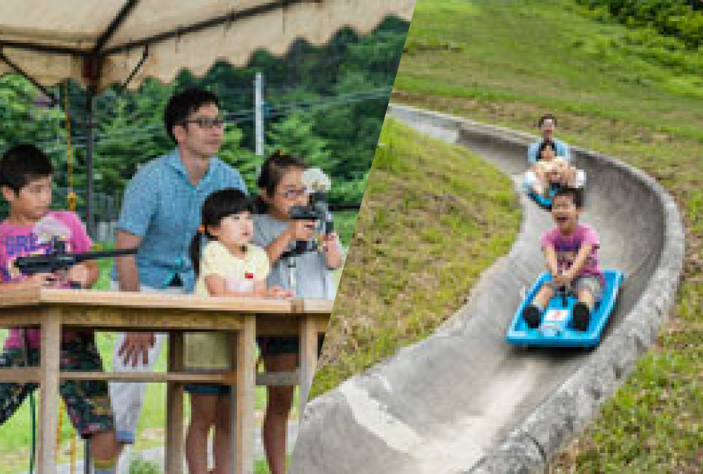爽快感とスピード感が味わえる全長650mのロングスライダーと、プラスチックのボールで、的に当たれば塗料がはじけて的を射抜くペイントボールを楽しめます。