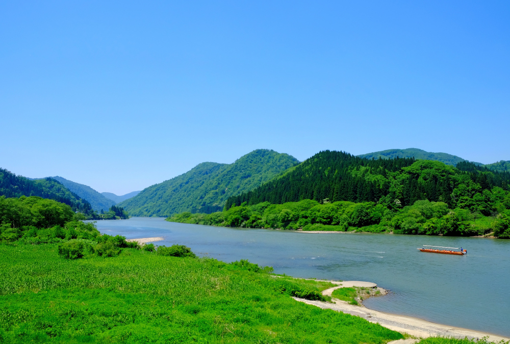 最上川の流れに身をまかせ、雄大な自然の中を船頭の舟唄を聞きながら景色を楽しめる最上峡芭蕉ライン舟下り。