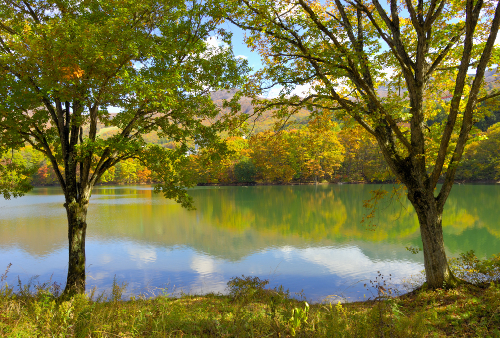 春は水芭蕉やレンゲツツジの花を楽しむことができ、秋は蔵王中央高原の山並みがよく見え、水面に映る紅葉がきれいです。